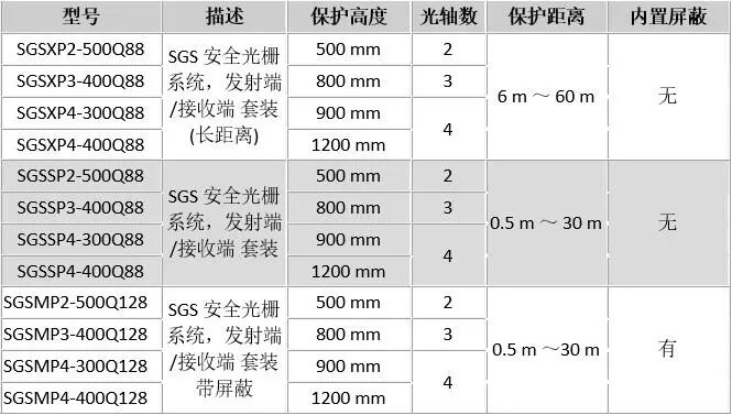SGS 安全多光束系統有內置和不帶內置屏蔽功能的型號可供選擇。既有傳統的發射/接收形式來進行超長距離的安全防護,同時還有主/從模式的型號以便客戶輕松地安裝更好地降低成本。更多產品信息,包括保護高度和檢測距離請查看下文的產品列表。